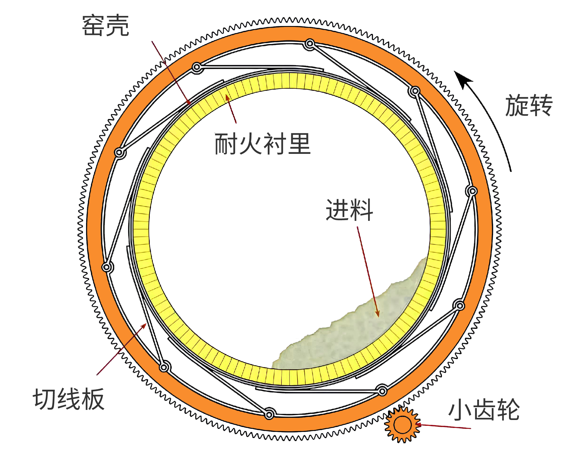 物料从窑尾(高端)送入窑内。由于筒体倾斜且缓慢转动,物料在轴向和径向滚动的同时逐渐向前移动。燃料通过窑头(低端)的燃烧器喷入窑内进行燃烧。热量通过辐射和传导传递给物料。在移动过程中,物料形成液相,生成硅酸三钙、硅酸二钙、铝酸三钙和铁铝酸四钙等矿物。完成烧结过程后,熟料形成并从窑头排出。