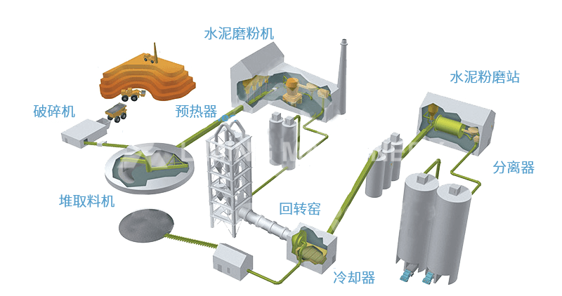 其主要由生料破碎、生料均化、生料粉磨、水泥煅烧、熟料冷却及储存、煤粉制备、熟料配料及粉磨站、成品包装等系统组成。