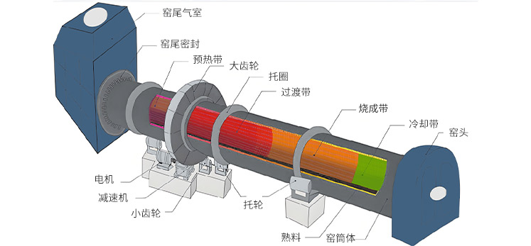 熟料煅烧系统采用低压损单列五级旋风预热器,配套由预热器、回转窑、篦冷机组成的新型干法工艺系统。入窑物料碳酸钙分解率可达 90%。回转窑采用两段支撑短窑,可有效降低设备投资成本15%–25%。