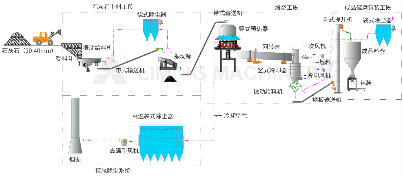 1 煅烧工序: 将筛选后的石灰石送入环保石灰窑进行高温煅烧,分解转化为生石灰。