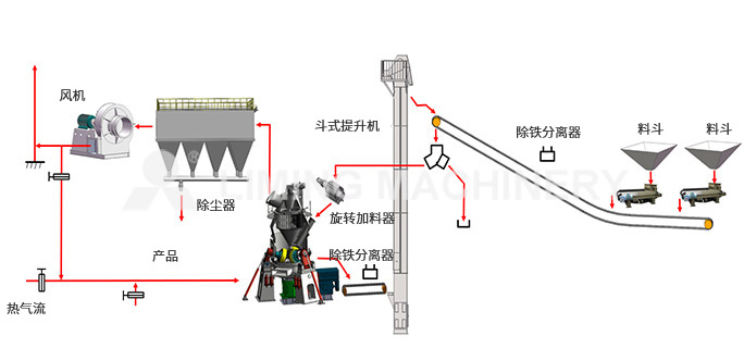水泥掺和料制粉原料主要包含火山灰、钢厂矿渣、水渣等活性物料。生产线采用一体化连续作业工艺,核心组成系统包括:原料计量输送系统、粉磨系统、返料系统、热风系统(选配)及成品仓储输送系统。
